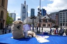Dazu Silvia Winkler, Geschäftsführerin des in Frankfurt ansässigen Oikocredit Förderkreis Hessen-Pfalz: „Gerade am Finanzstandort Frankfurt gilt es, das Thema Geld als Gestaltungsmittel für Gerechtigkeit weltweit in den Fokus zu setzen.  Denn wir sitzen an einer weltweiten Tafel, die nicht gerecht gedeckt ist. Das Vermögen auf dieser Welt ist sehr ungleich verteilt. Und auch der Zugang zu Finanzdienstleistungen ist nicht gerecht: Rund 1,7 Milliarden Menschen weltweit haben keinen Zugang zu grundlegenden Finanzdienstleistungen wie Konten oder Versicherungen. Oikocredit möchte in der Öffentlichkeit für einen bewussten, ethischen Umgang mit Geld und für einen gerechten Zugang zu Finanzmitteln weltweit werben. Die Installation mit den großen Geldsäcken war ein echter Hingucker und hat Anlass zu vielen guten Gesprächen gegeben .“