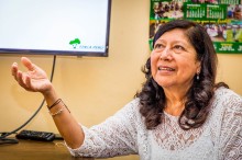 Iris Lanao, Geschäftsführerin der Mikrofinanzorganisation Finca Perú, erzählt, wie sie mit Hilfe der von der Oikocredit Stiftung Deutschland geförderten Umfrage neue Angebote für ihre Klientinnen entwickelt haben. ©Opmeer Reports